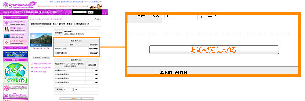 その他、「商品オプション」に時間を指定をするものもございます。ご希望のお時間を選択の上、【買い物かごに入れる】ボタンをクリックしてください。