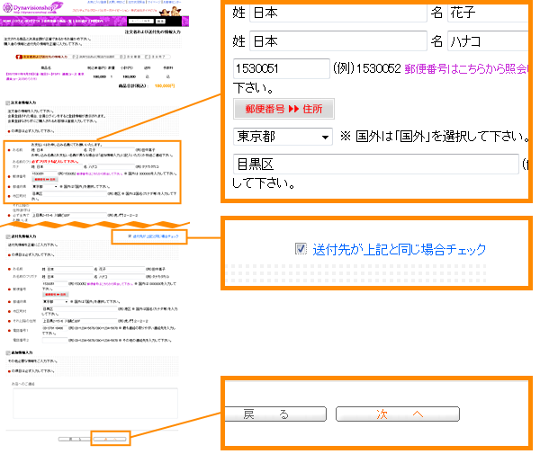 「送付先情報入力」が上記と同じ場合、「送付先が上記と同じ場合チェック」にチェックを入れてください。