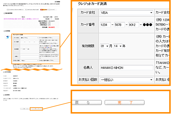 クレジットカードをご選択のお客様は、上の画像の通り、クレジットカード情報をご記入頂き、商品名、決済金額、注文者情報に間違いがない事をご確認の上、【完了】のボタンをクリックしてください。
